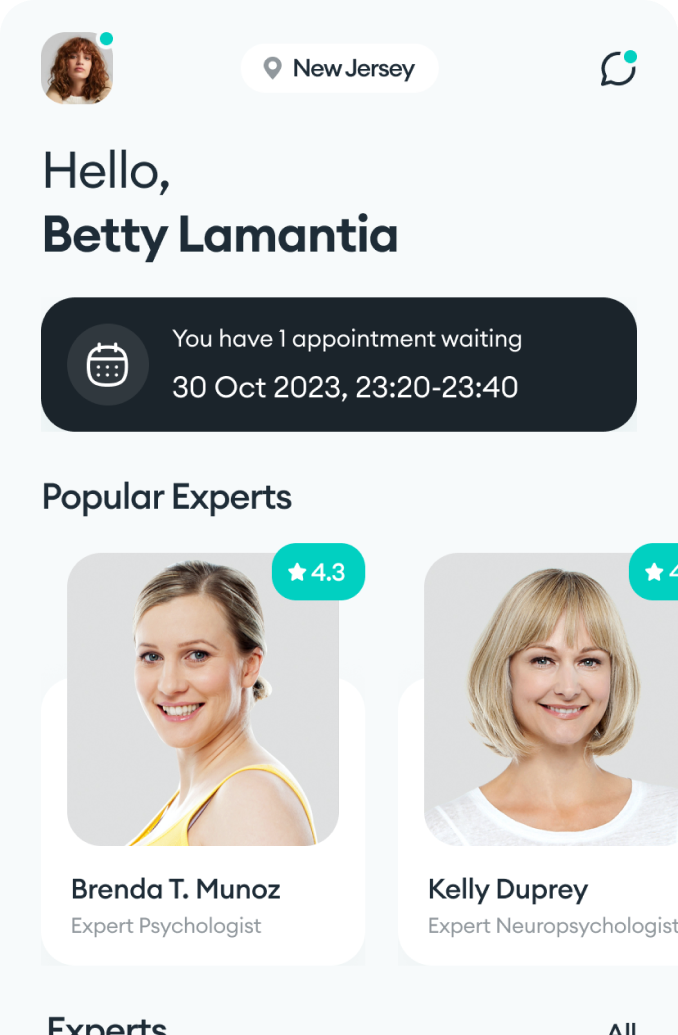• Start online therapy with your chosen specialist within a minute, either via video or audio.